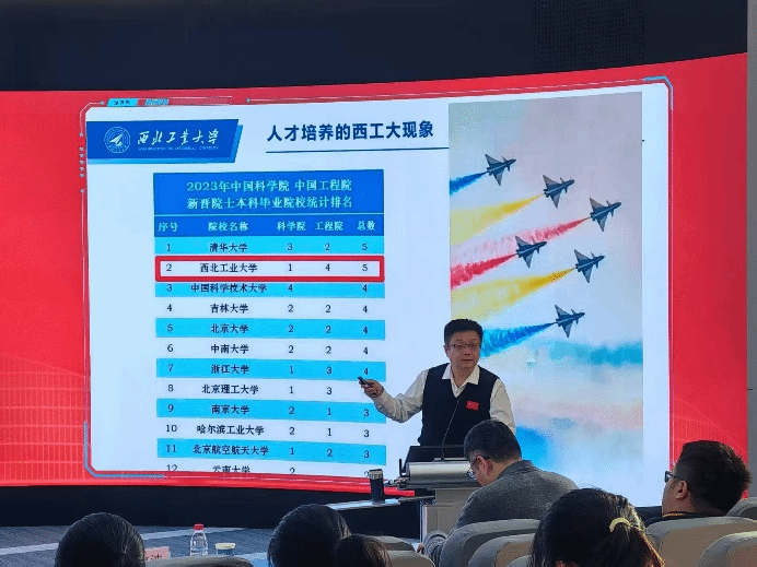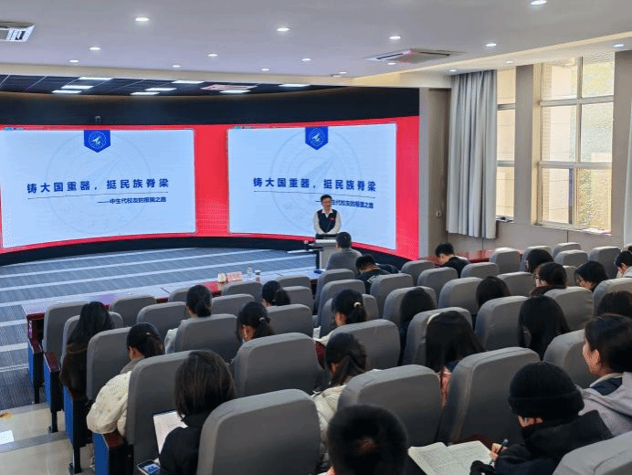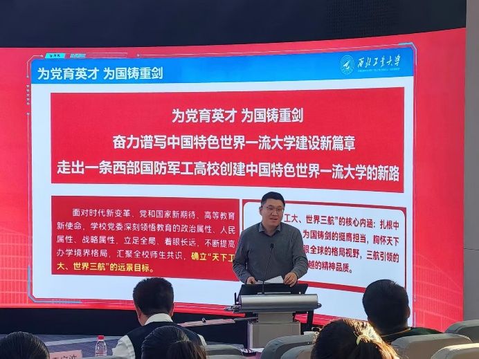 王宇波以“为谁培养人、培养什么人、怎样培养人”的教育根本问题为开篇,从“古路坝灯火”救国初心切入,深情讲述师昌绪、陈士橹等老一代前辈“科技救国”的伟大壮举;精准聚焦唐长红、陈勇等中生代校友铸大国重器的使命担当;细致讲解尹东、唐勇等新生代校友的强国实践。他通过“一个甲子的坚守”“史上最牛航空班”等一个个感人故事与动人细节深度解读人才培养的“西工大现象”,生动地为同学们展现了我校在不同时期为党育人、为国育才的深刻实践,勾勒出西工大人才培养传承图谱。他勉励同学们要将学校“公诚勇毅”“三实一新”的校训校风融入自己的成长生涯,结合娱乐城