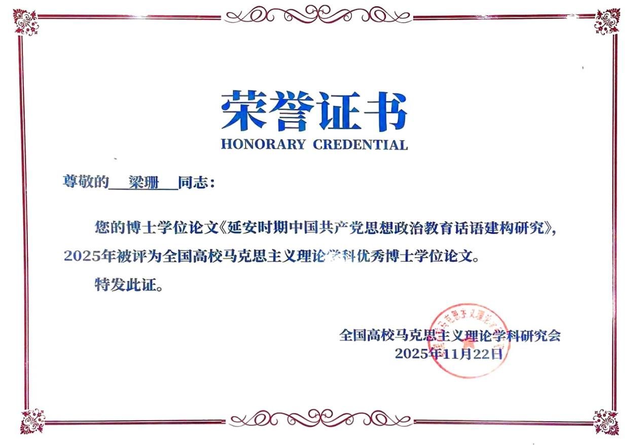 2022届毕业生梁珊的博士学位论文《延安时期中国共产党思想政治教育话语建构研究》成功荣获该奖项,其指导教师为张云龙教授。
