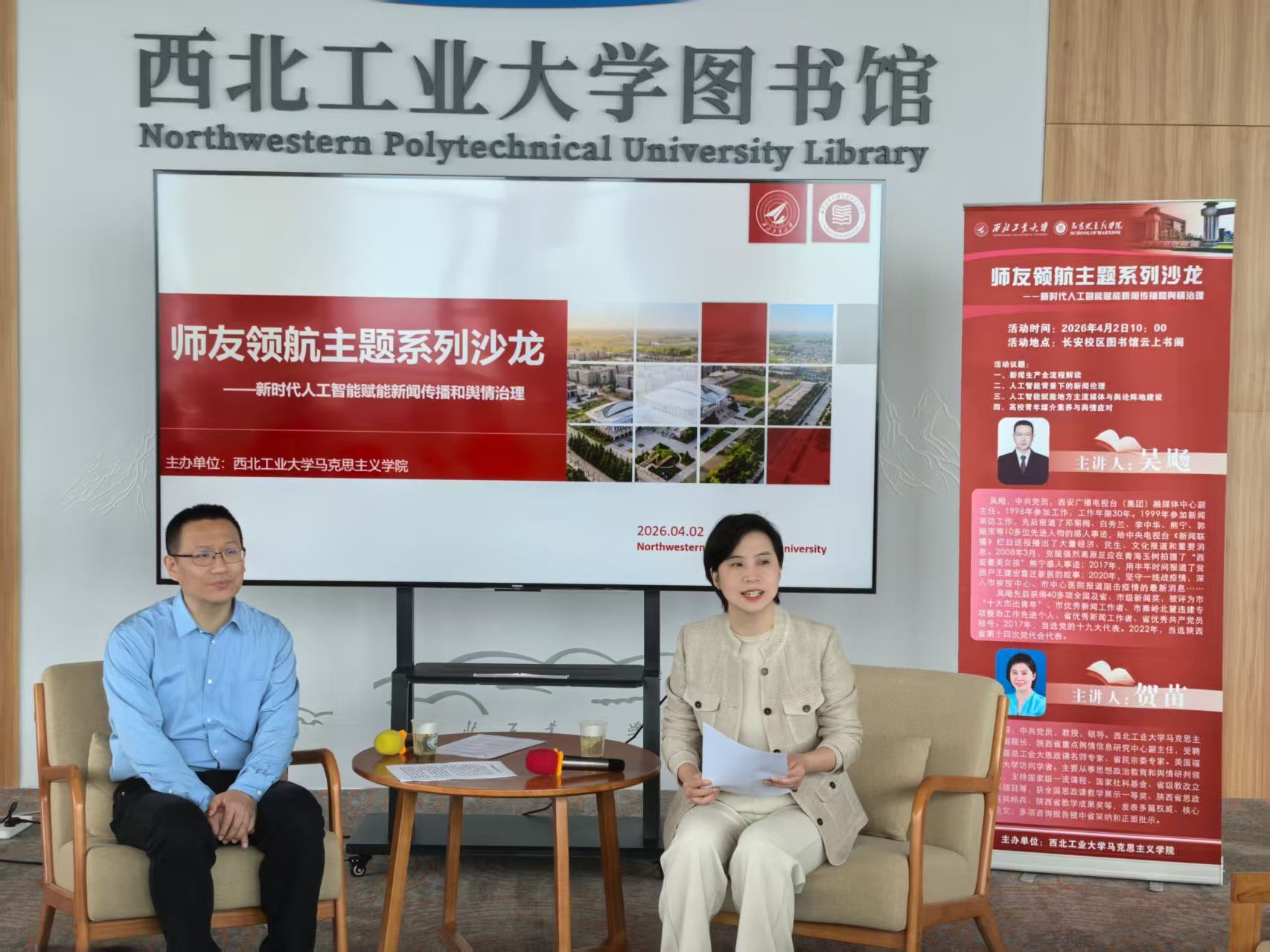 持续深化师生交流,助力学子成长,推进“大思政课”立德树人实效,创新开展师友领航主题系列沙龙。4月2日,特邀西安广播电视台(集团)融媒体中心副主任吴飏,聚焦融媒时代新闻宣传工作发展与舆情生态变革,为师生带来前沿分享与深度探讨。本次沙龙在长安校区云上书阁进行,娱乐城